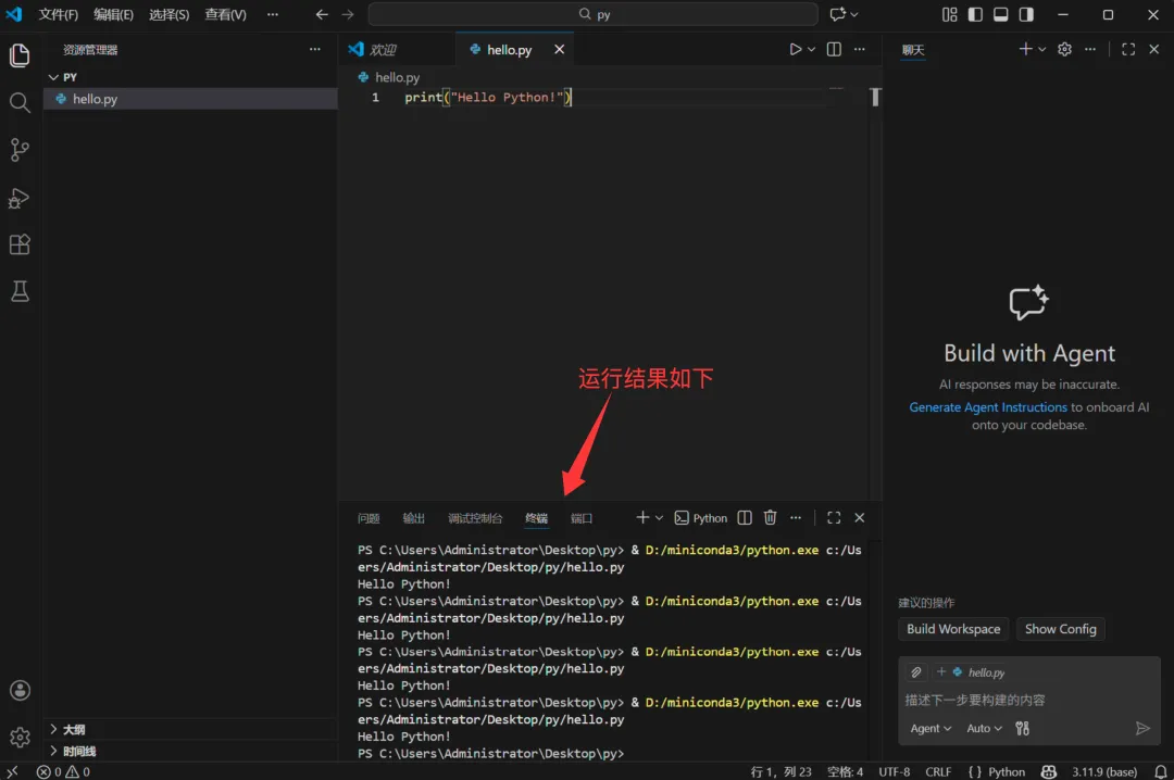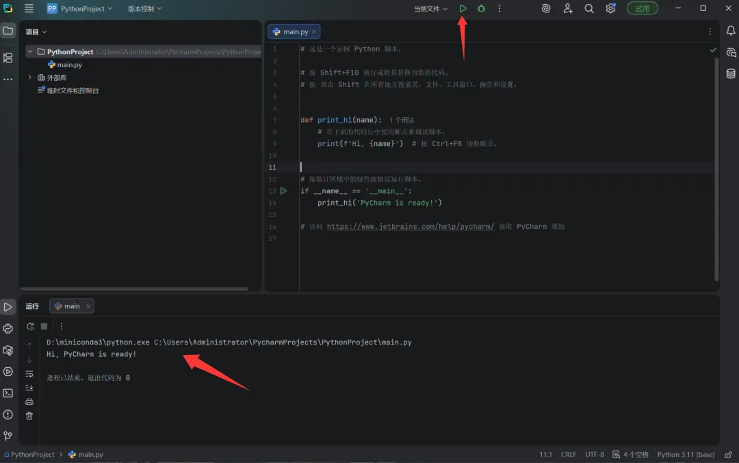 输出成功,就说明PyCharm已成功绑定Miniconda3环境。