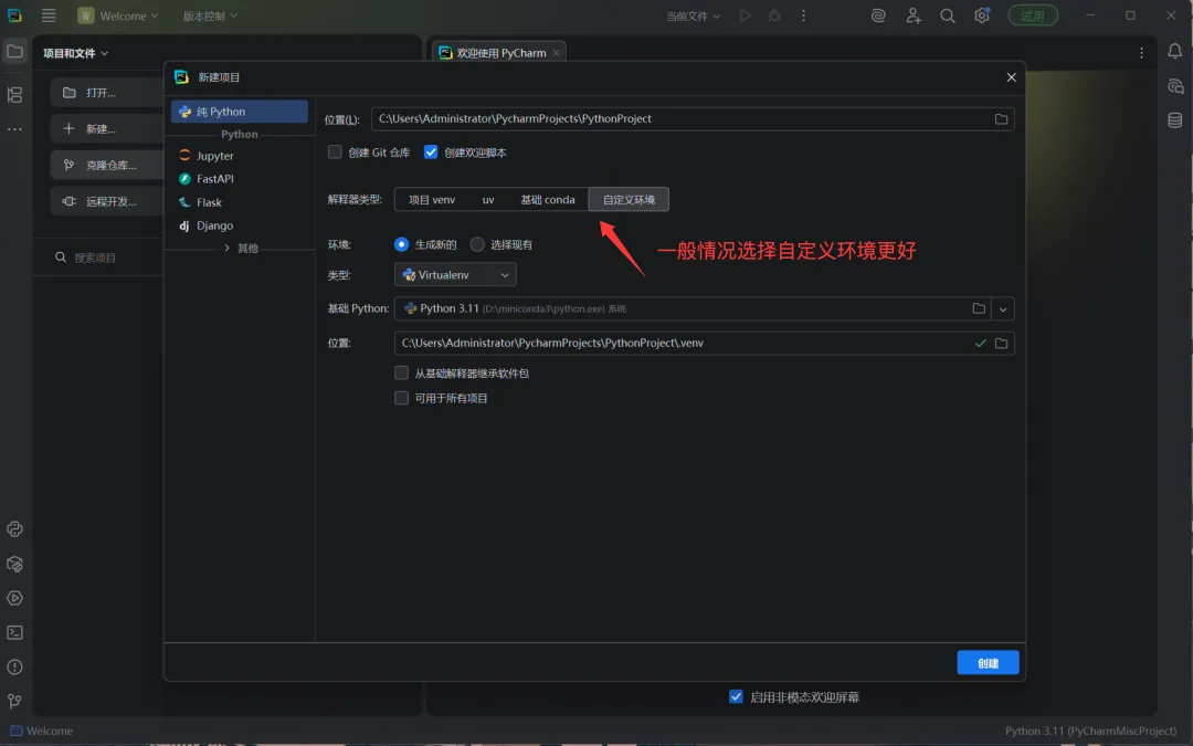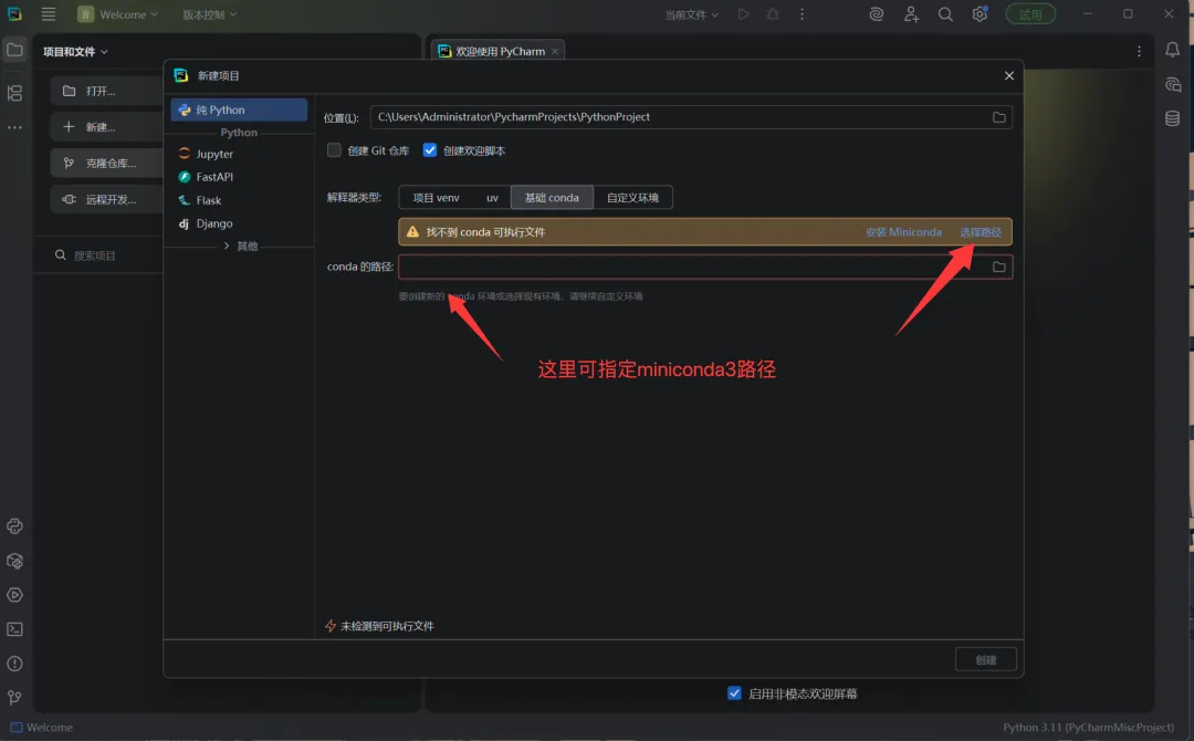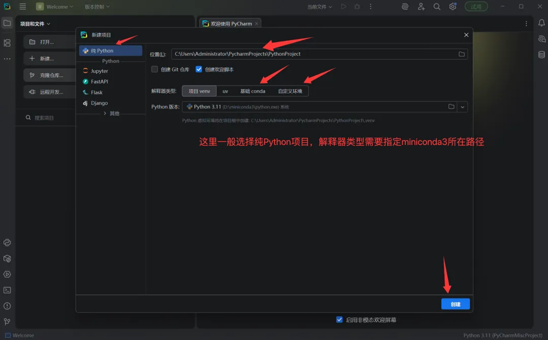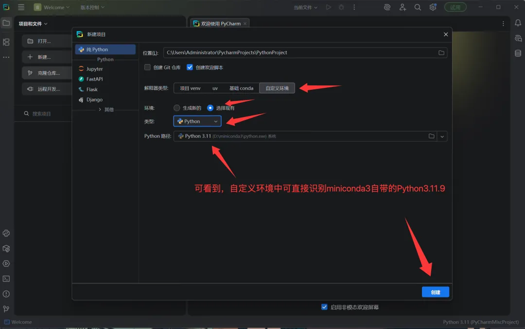 Step 2:创建项目并选择Miniconda3环境