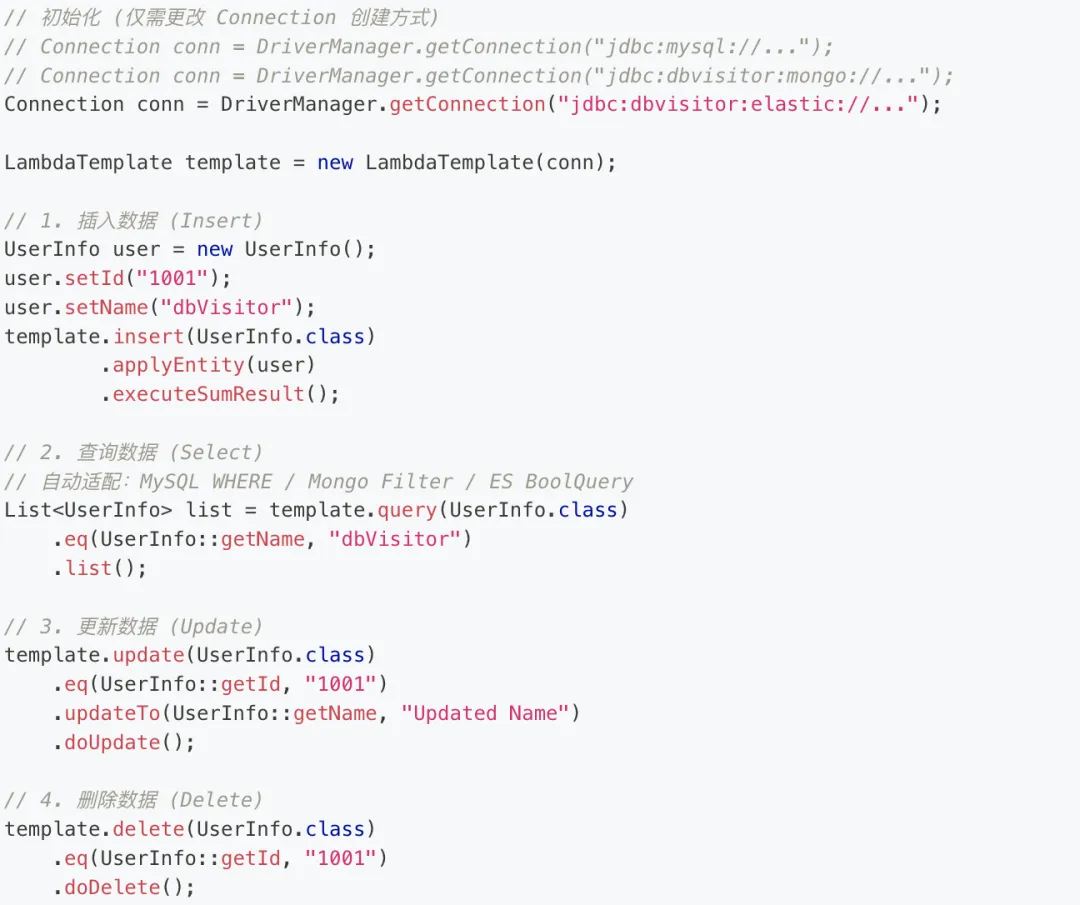 为了让大家更直观地感受"One API"的魅力,以最常见的 CRUD 操作为例,展示 dbVisitor 如何在不同数据源间保持统一的编码体验。