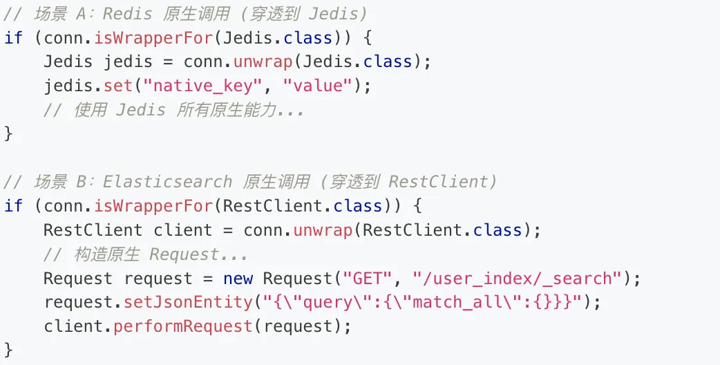 当统一 API 无法满足特殊需求时(例如 Redis 的特定原子操作,或 ES 的特殊聚合),dbVisitor 允许通过unwrap机制“穿透”到底层驱动,直接使用原生 SDK。