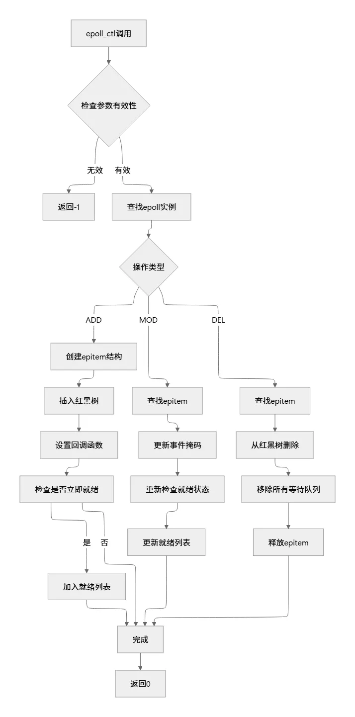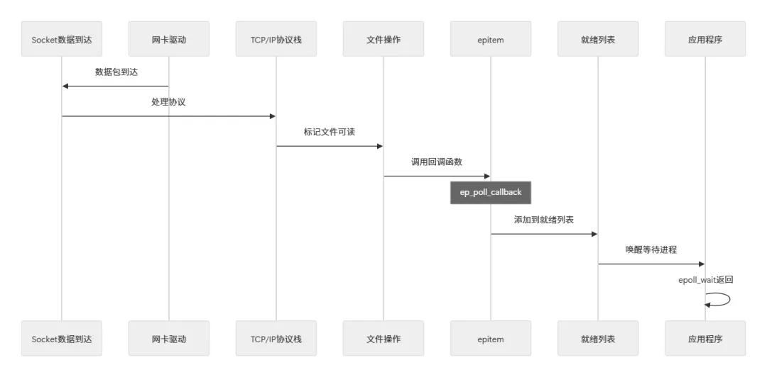 // 回调函数核心逻辑static int ep_poll_callback(wait_queue_entry_t *wait, unsigned mode, int sync, void *key){struct epitem *epi = ep_item_from_wait(wait);struct eventpoll *ep = epi->ep; // 1. 将epi添加到就绪列表 list_add_tail(&epi->rdllink, &ep->rdllist); // 2. 如果eventpoll正在等待, 唤醒它 if (waitqueue_active(&ep->wq)) wake_up_locked(&ep->wq); // 3. 如果使用了边缘触发, 还需要检查其他条件 // ... return 1;}