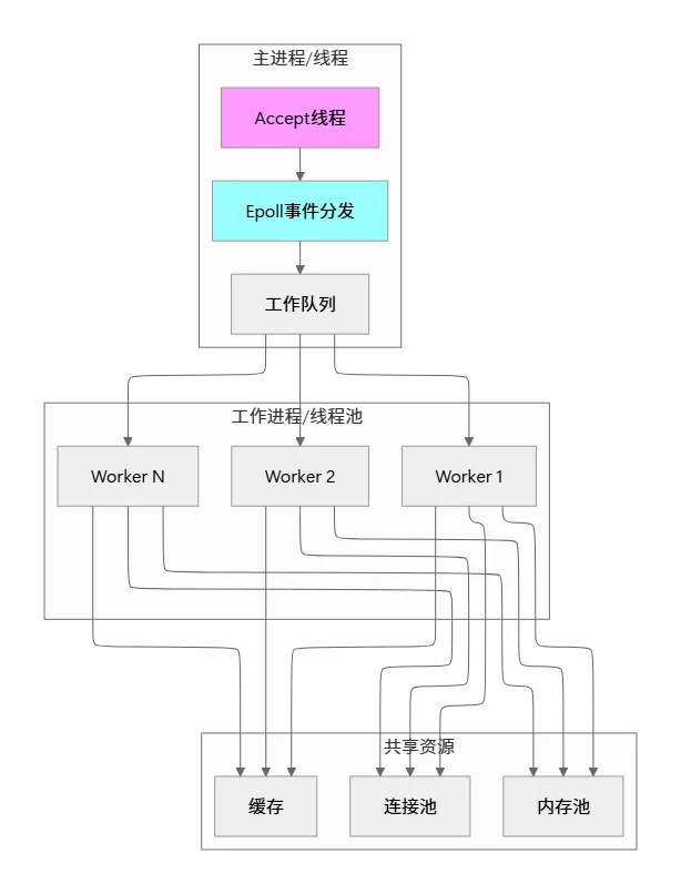 // 使用EPOLLEXCLUSIVE避免惊群ev.events = EPOLLIN | EPOLLEXCLUSIVE;epoll_ctl(epoll_fd, EPOLL_CTL_ADD, listen_fd, &ev);