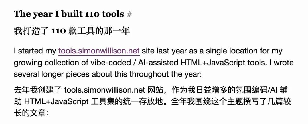 今天看了一篇非常精彩的文章,一个黑客用27个趋势小篇章总结了2025年的大模型。内容非常硬核,但是又非常亲民。我等平民小老百姓也能看懂看得很投入。你看这章节小标题起的,多好。结尾我会附带原文链接。遇到这种神人,我肯定是非常好奇,但只知道名字叫Simon Willison。没有背景信息。Gemini找到了非常多的背景资料,但你只需要知道这两句话。Simon Willison 是技术圈里真正的“宝藏博主”和“顶级大佬”。 一个坚持了 20 年‘build in public’的顶级黑客。但是今天不是要分享他的复盘,而是其中一个看起来很不起眼,但是让我非常兴奋的文章片段。大哥在2025年,用 AI coding 做了110个工具。这太令人震惊了,所以我今天花了两个小时的时间,去挨个试用体验了一下。都说2026会是AI coding 应用之年。有个人在25年就做了这个实验。这个图就是部分展示,接下来给你看看我试用的部分工具。1.工具:红批提取器(red annotation extractor)