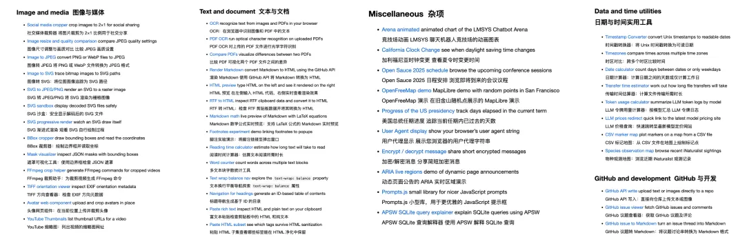 链接:https://tools.simonwillison.net/open-sauce-2025但是牛逼的地方在于,大哥是用手机编程写的这个页面。牛。多了我就不再给你展示了,因为非常多都是技术相关的。类似这种测试一下JS代码的效率呀,或者做个什么All in one API规则呀。就是不用Gemini解释我都看不懂的,我就不说了,我也说不明白。但你发现没有,这110个被黑客大佬coding出来的工具。有特别复杂,特别难理解,特别需求爆炸的吗?好像并没有。他只是刚好需要,或者不想重复,就顺手搞了一个。没有服务任何人的包袱,只有服务自己,就是为了自己省事。你看完这些工具,你会发现,你只要动手,你就可以做出来。在 AI coding 的加持下,成为自己的工具哆啦A梦!