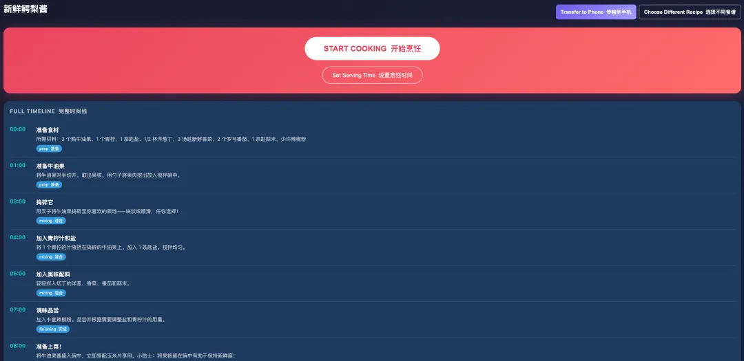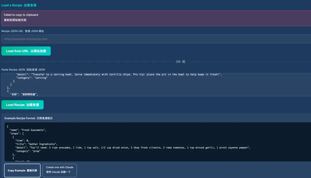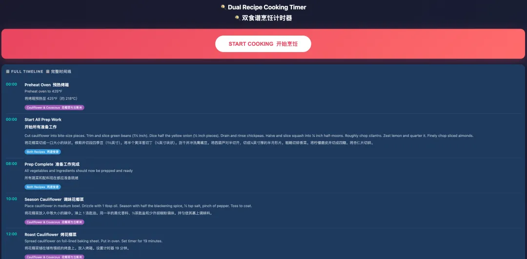 链接:https://tools.simonwillison.net/cooking-timer就是帮你把菜谱里的时间,变成拆解步骤,按照从开始到完成的时间倒计时的工具。计时器打开那一瞬间,贼刺激,虽然我没做饭,但我有一种分手厨房开战的即视感。唯一的问题是,你想用这个计时器,你还得先把你的菜谱写成JSON的形式。3.双菜谱烹饪计时器(dual recipe cooking timer)