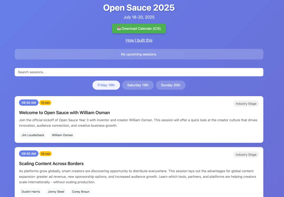 链接:https://tools.simonwillison.net/arena-animated这个非常有意思。就是记录大模型的比分,可惜数据只记录了23年5月8日到24年6月23日。网上也有很多类似的,楼层高度的对比,海贼王身高的对比,不同时间段影视剧的热度对比等。17.Open Sauce活动日历表(Open Sauce 2025)