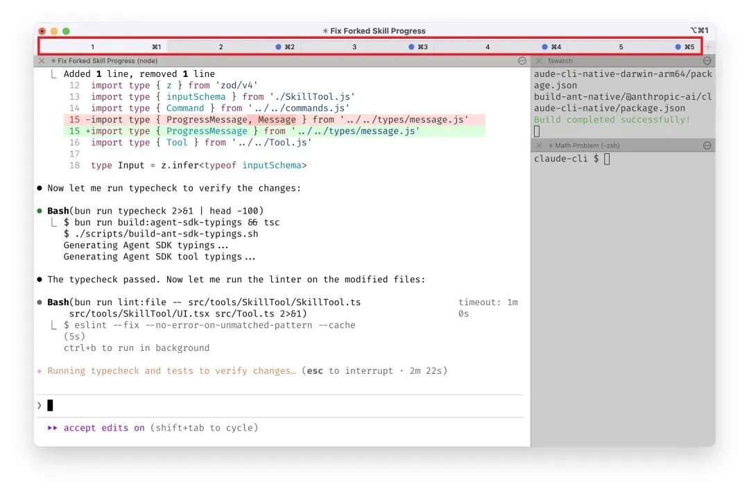 我在终端中并行运行 5 个 Claude 进程,我将标签页从 1 到 5 编号,并使用系统通知来了解何时需要给某个 Claude 输入。