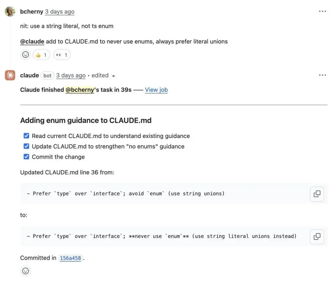 这张图是在 GitHub 的代码评论区,Boris Cherny 发现代码规范问题后直接 @Claude 下达指令,要求它把“禁止使用某种代码写法(Enum)”这条新规矩更新到 CLAUDE.md 里。