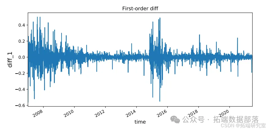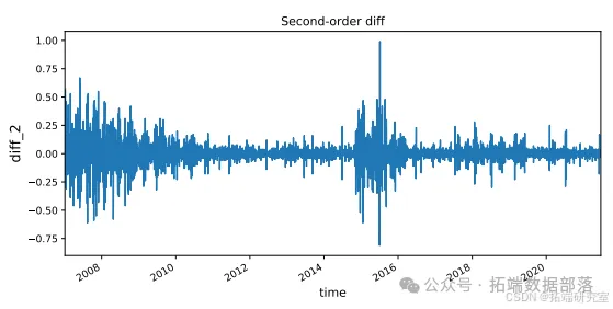 # 计算一阶差分training\_set\['diff\_1'\] = training_set\['close'\].diff(1)plt.figure(figsize=(10, 6))training\_set\['diff\_1'\].plot()plt.title('一阶差分')plt.xlabel('时间', fontsize=12, verticalalignment='top')plt.ylabel('diff_1', fontsize=14, horizontalalignment='center')plt.show()# 计算二阶差分training\_set\['diff\_2'\] = training\_set\['diff\_1'\].diff(1)plt.figure(figsize=(10, 6))training\_set\['diff\_2'\].plot()plt.title('二阶差分')plt.xlabel('时间', fontsize=12, verticalalignment='top')plt.ylabel('diff_2', fontsize=14, horizontalalignment='center')plt.show()
