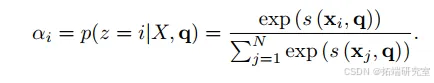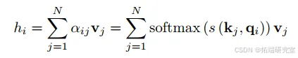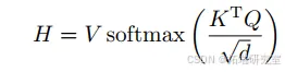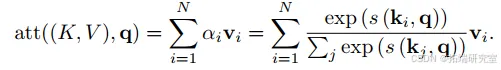 在这里,通过缩放点积得到的是注意力得分,(d)是输入的维度。假设输入的键值对((K;V)=[(k_{1};v_{1});\cdots;(k_{N};v_{N})]),对于给定的(q),注意力函数如下: