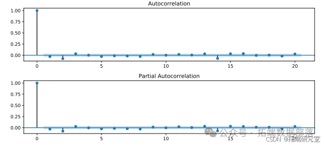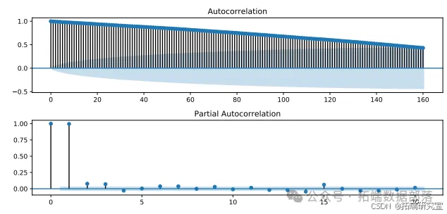 通过对原始序列和一阶差分序列进行ADF检验的结果表明,原始序列是非平稳的,一阶差分序列是平稳的。在确定(d = 1)后,我们需要确定ARIMA中的(AR(p))和(MA(q))。我们利用自相关图(ACF)和偏自相关图(PACF)来确定。原始序列和一阶差分序列的ACF和PACF如图所示