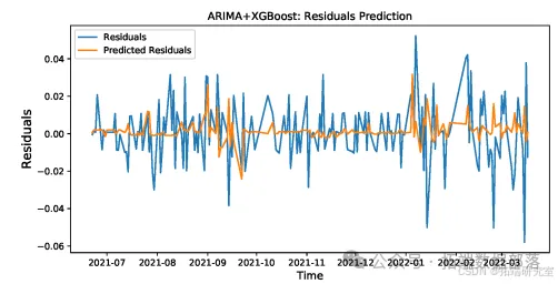 # 准备数据,划分训练集和测试集train, test = prepare\_data(merge\_data, n\_test=180, n\_in=6, n_out=1)# 进行前向验证,获取真实值和预测值y, yhat = walk\_forward\_validation(train, test)plt.figure(figsize=(10, 6))plt.plot(time, y, label='Residuals')plt.plot(time, yhat, label='Predicted Residuals')plt.title('ARIMA + XGBoost: Residuals Prediction')