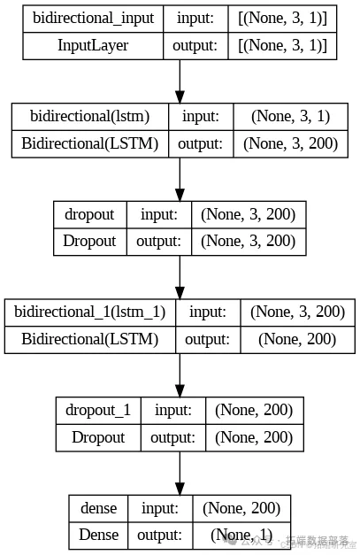 上述代码首先构建了一个包含两层双向 LSTM 层以及相应的Dropout层(用于防止过拟合)和输出层的序列模型,然后对模型进行编译,指定了优化器、损失函数以及评估指标等,最后通过summary函数查看模型的结构和参数信息。使用tf.kel函数可以可视化模型结构,代码如下: