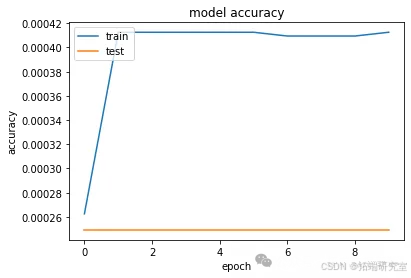 plt.plot(hist.history\['accuracy'\])plt.plot(hist.history\['val_accuracy'\])plt.title('model accuracy')plt.ylabel('accuracy')plt.xlabel('epoch')plt.legend(\['train', 'test'\], loc='upper left')plt.show()plt.plot(hist.history\['loss'\])plt.plot(hist.history\['val_loss'\])plt.title('model loss')plt.ylabel('loss')plt.xlabel('epoch')plt.legend(\['train', 'test'\], loc='upper left')plt.show()