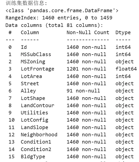 #1、导入相关pyhton库import pandas as pd #用于数据清洗等预处理from sklearn.ensemble import RandomForestRegressor #随机森林回归模型from sklearn.metrics import mean_absolute_error #均值绝对误差指标,评估结果from sklearn.model_selection import train_test_split #导入数据集划分模型#2、导入数据集train_data = pd.read_csv('/kaggle/input/house-prices-advanced-regression-techniques/train.csv')test_data = pd.read_csv('/kaggle/input/house-prices-advanced-regression-techniques/test.csv')sample_submission = pd.read_csv('/kaggle/input/house-prices-advanced-regression-techniques/sample_submission.csv')#3.快速查看数据print("训练集形状:", train_data.shape)print("测试集形状:", test_data.shape)print("\n训练集前几行:")display(train_data.head())print("\n训练集数据信息:")train_data.info()