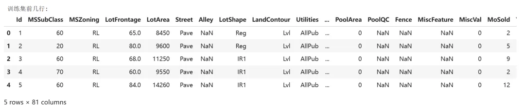 从以下测试集数据信息中可以看到,测试集中没有“80 SalePrice”列,而这也正是需要模型预测的。