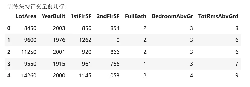 #选择特征变量和目标变量并查看数据features = ['LotArea', 'YearBuilt', '1stFlrSF', '2ndFlrSF', 'FullBath', 'BedroomAbvGr', 'TotRmsAbvGrd']train_X = train_data[features]train_y = train_data.SalePriceprint("\n训练集特征变量前几行:")display(train_X.head())#测试集特征变量test_X=test_data[features]