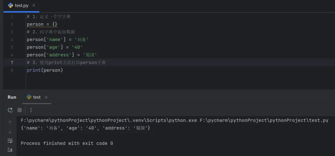 # 1、定义一个空字典person = {}# 2、向字典中添加数据person['name'] = '刘备'person['age'] = '40'person['address'] = '蜀国'# 3、使用print方法打印person字典print(person)