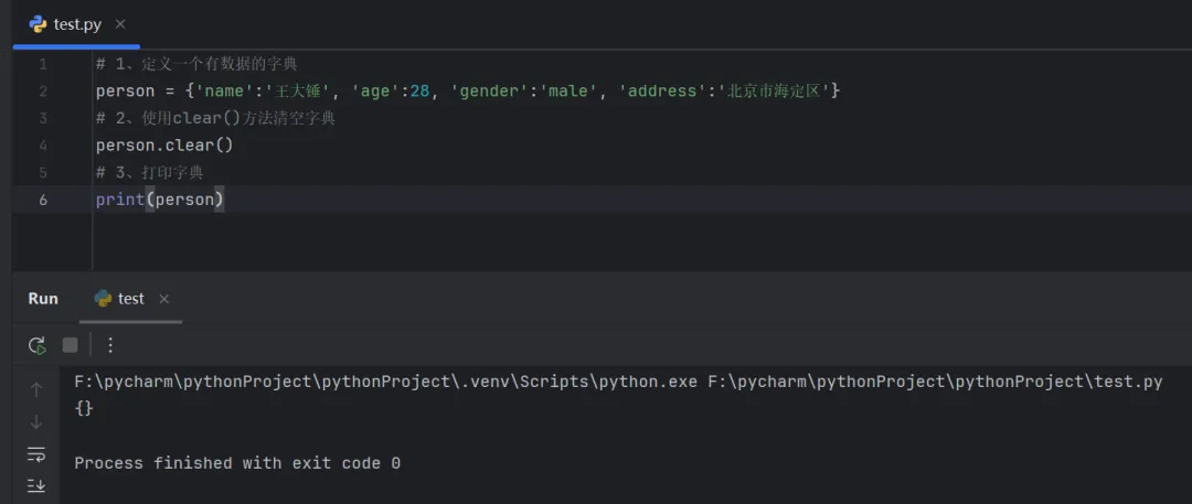 # 1、定义一个有数据的字典person = {'name':'王大锤', 'age':28, 'gender':'male', 'address':'北京市海定区'}# 2、使用clear()方法清空字典person.clear()# 3、打印字典print(person)