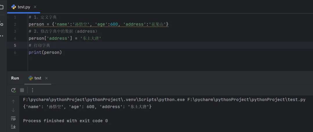 # 1、定义字典person = {'name':'孙悟空', 'age':600, 'address':'花果山'}# 2、修改字典中的数据(address)person['address'] = '东土大唐'# 打印字典print(person)