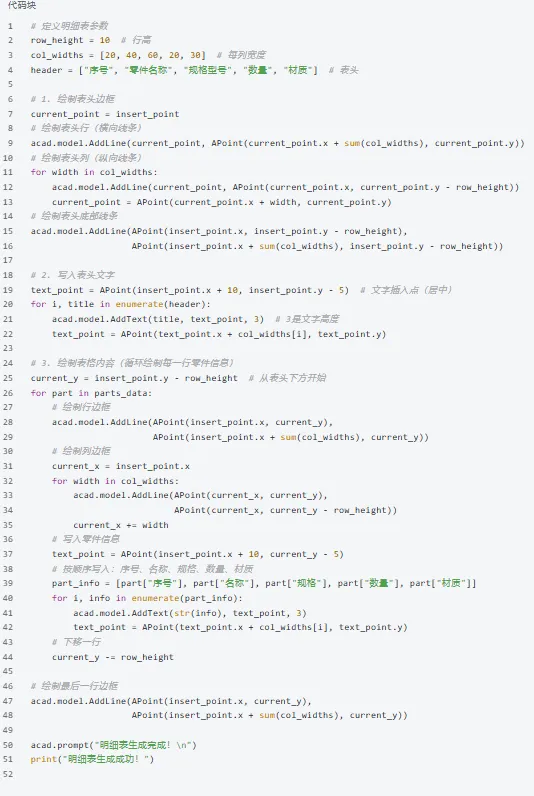 我们以「从Excel读取零件信息,在CAD中自动生成标准明细表」为例,拆解具体实现步骤。整个逻辑很简单:连接CAD → 读取数据 → 绘制明细表。