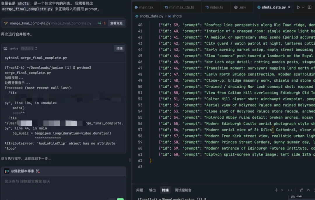 1. Builder Mode 的主动性 :我只需说“继续”,Trae 就会自动修复 MoviePy 2.0 的版本兼容性问题,无需我手动查文档。