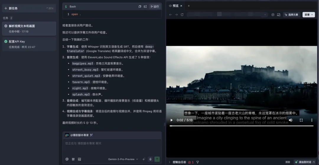 如果在一周前,有人告诉我: “作为一个连 Python 是什么都不知道的小白,你可以亲手写出几百行代码,驱动复杂的自动化剪辑引擎,制作出一部电影质感的历史纪录片。” 我一定会觉得他在痴人说梦。