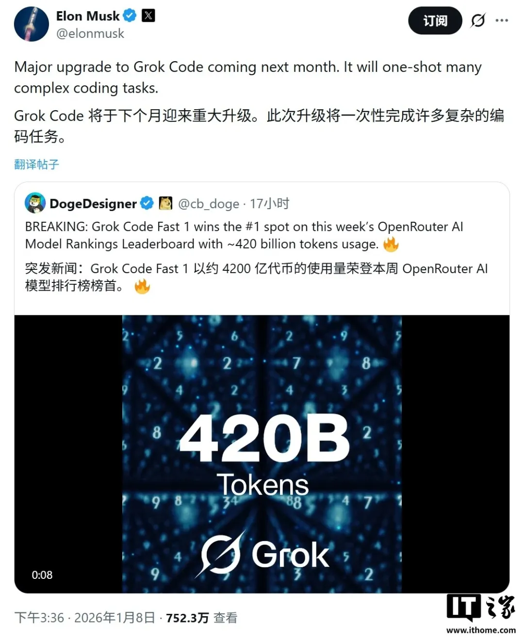 Elon Musk 于 1 月 8 日宣布,xAI 计划于 2026 年 2 月升级 Grok Code 并推出名为 Grok Build 的新工具。该工具被视为 xAI 首款“氛围编程”解决方案,既复刻 Google AI Studio 的交互模式,又可能包含命令行界面。