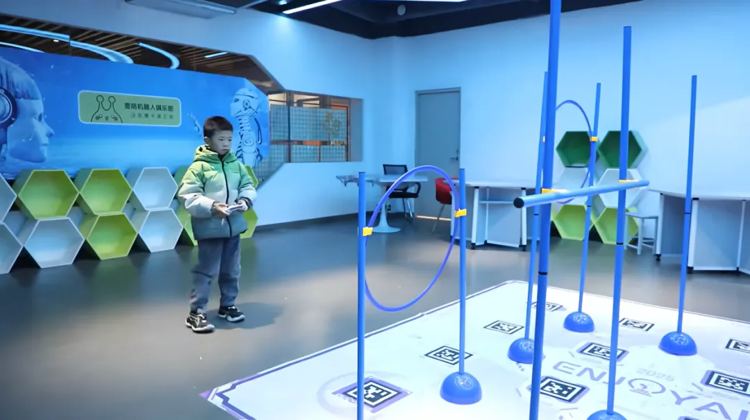 比赛中,陈勋坤沉着应战,独立完成了机器人搭建、算法编程与路径规划的全流程挑战,最终操控无人机穿越重重障碍,摘得桂冠。