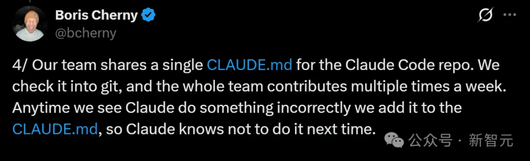 Boris的团队会共享一个CLAUDE.md用于 Claude Code仓库。他们会将其提交到git,整个团队每周贡献多次。