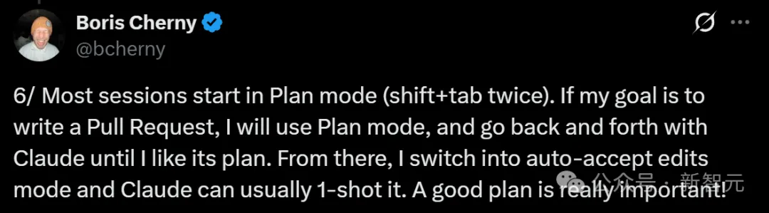 大多数会话以Plan模式启动。如果目标是写一个Pull Request,他就会使用Plan模式,并与Claude来回沟通,直到满意为止。