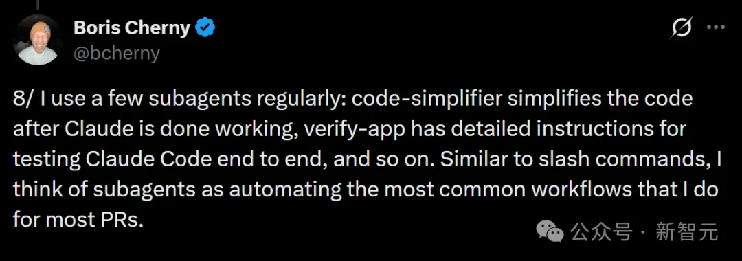 和斜杠命令类似,Boris把子代理看作是对大多数PR中最常见工作流的自动化封装,会把那些重复、固定的流程交给它们。