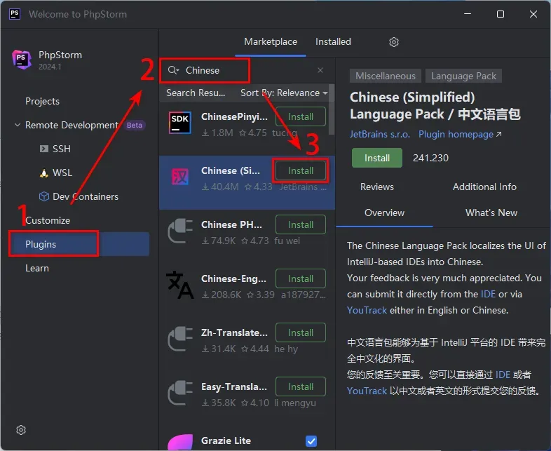 24.点击Plugins,输入:Chinese,找到Chinese(Simplified),点击“Install”