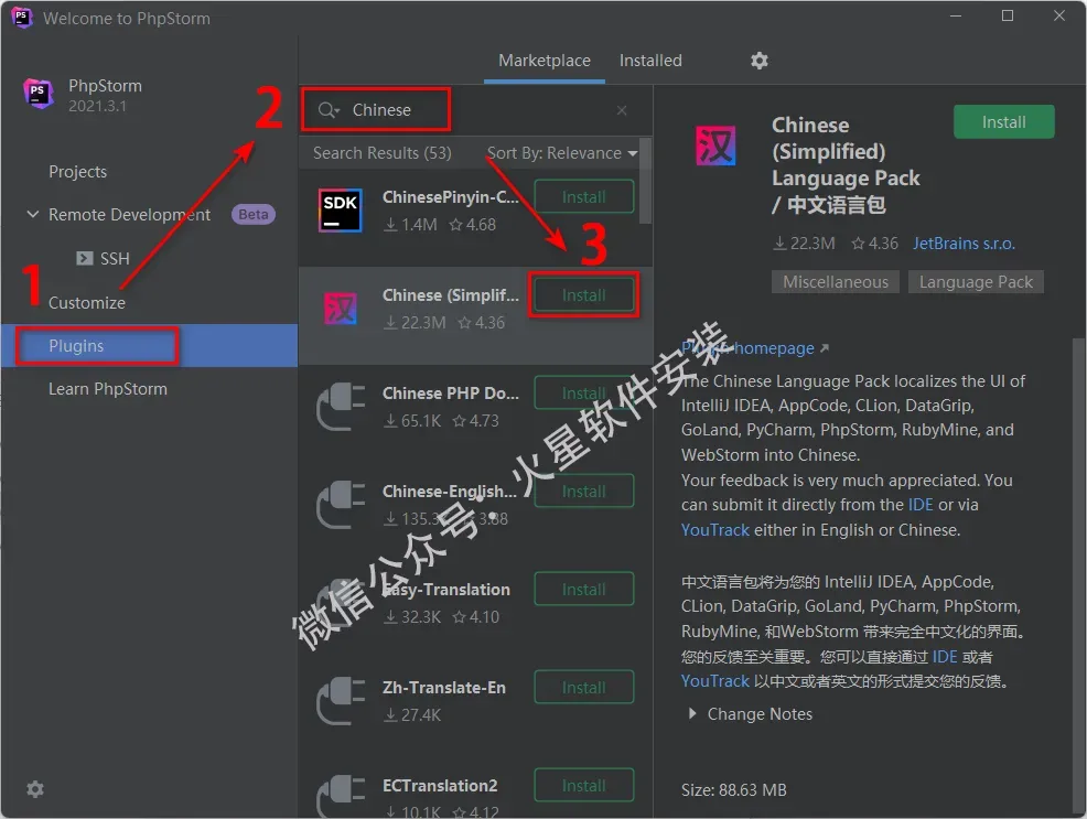 22.点击Plugins,输入:Chinese,找到Chinese(Simplified),点击“Install”