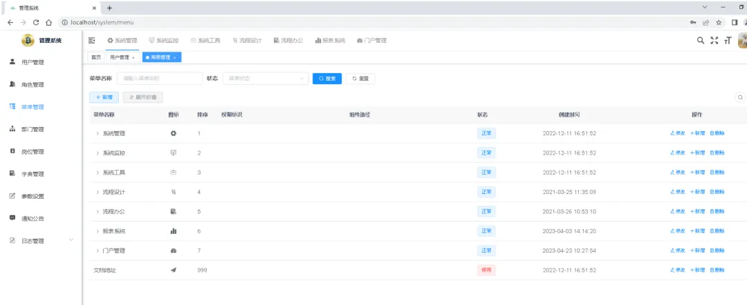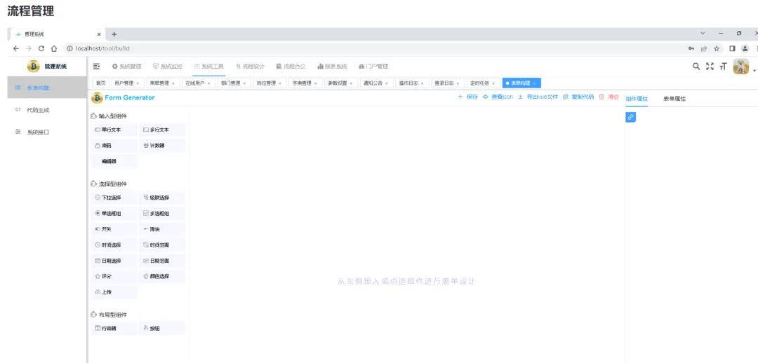 基于若依(RuoYi)框架的快速开发平台,采用前后端分离架构。系统集成了Flowable工作流引擎、积木报表、门户管理等企业级功能。