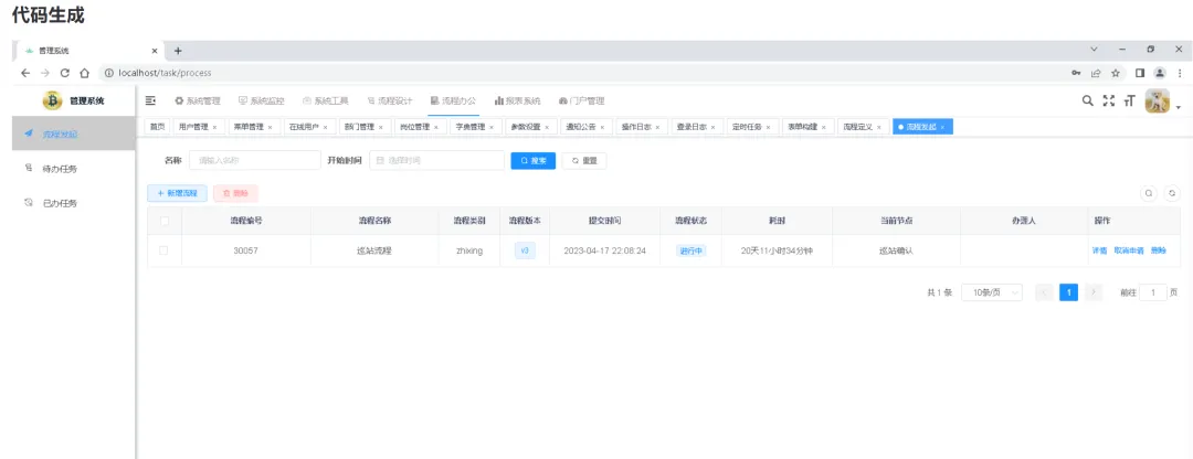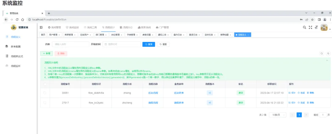 Flowable工作流引擎集成:内置Flowable工作流引擎,支持复杂业务流程的设计、执行、监控与优化。用户可以通过可视化界面定义工作流,实现审批、任务分配、状态跟踪等业务流程自动化,极大提升企业运营效率。