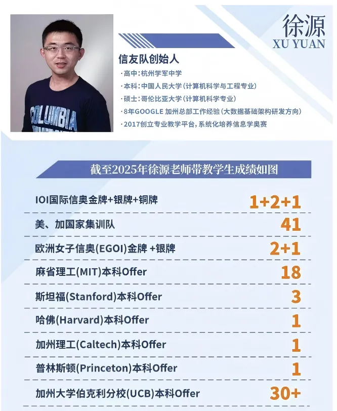 教学团队曾斩获多项佳绩:7次世界冠军、6枚IOI 国际信奥竞赛国际金牌、4枚ISIJ 国际初中生信奥竞赛国际金牌、56枚NOI全国信奥决赛金牌、63枚APIO 亚洲与太平洋地区信奥金牌、770+人次NOIP 全国信奥联赛一等奖……