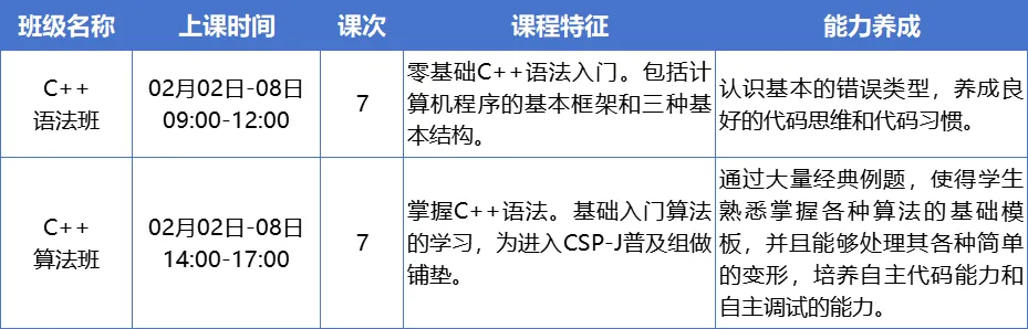 不少家长担心“孩子没有基础能否学好编程”?为此,特训营设计了科学合理的课程体系:针对10-15岁青少年,采用线下集中授课形式,开设有C++语法班(适合0基础学生)、C++算法班(适合已掌握C++语法的学生)两个班型。