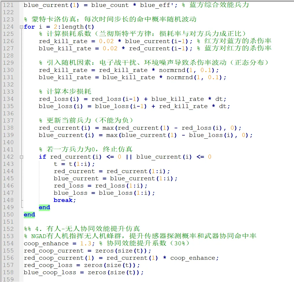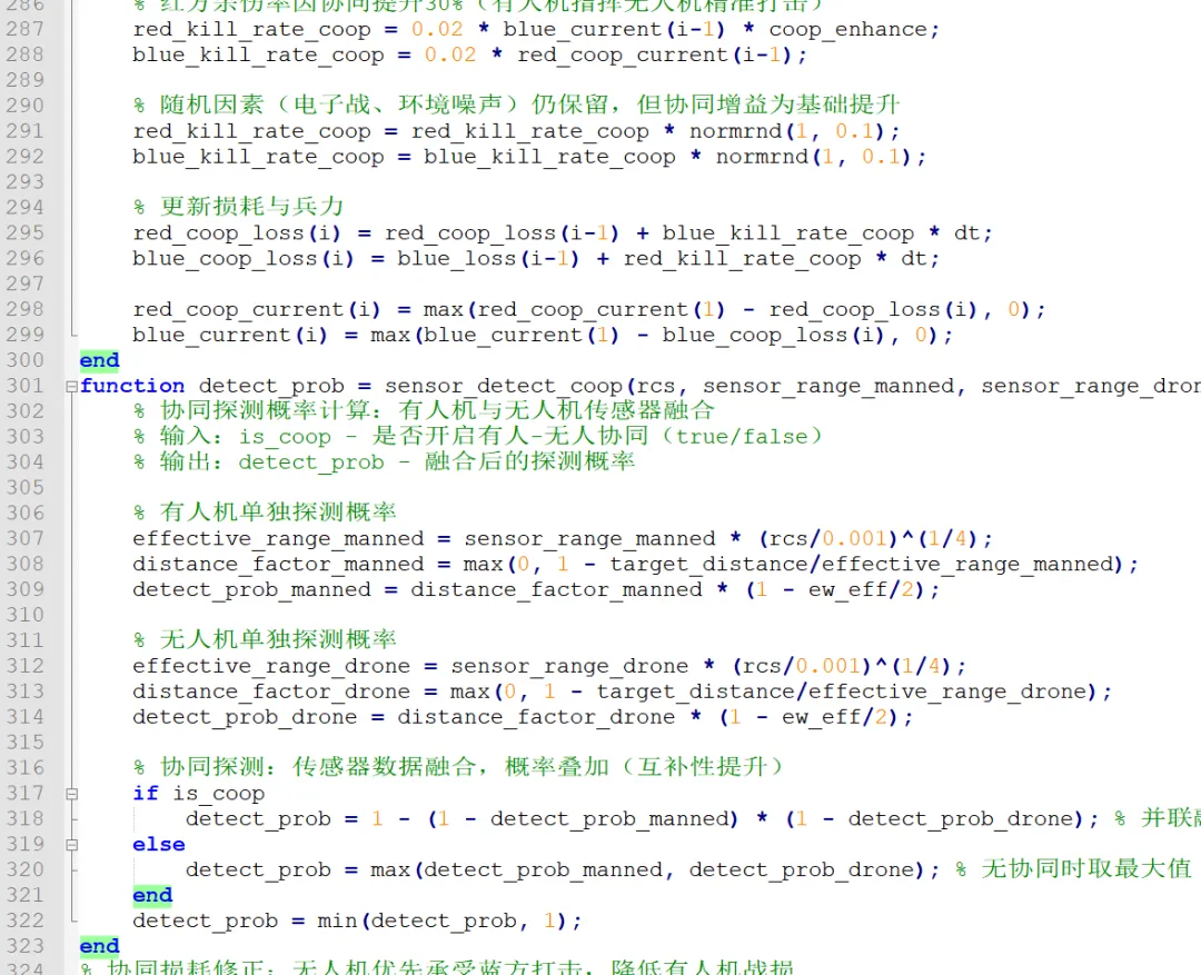 在美军 NGAD 作战能力评估的 MATLAB 仿真代码中,有人 - 无人协同(MUM-T,Manned-Unmanned Teaming) 是通过效能增强建模、协同交互逻辑、战场能力增益三个核心层面实现的,其核心是模拟 NGAD 有人机作为指挥节点,对无人机蜂群的态势感知、火力打击、生存能力进行赋能,从而体现协同作战的代际优势。以下从实现原理、代码具体落地、扩展优化三个维度详细拆解。MUM-T 的核心实现原理