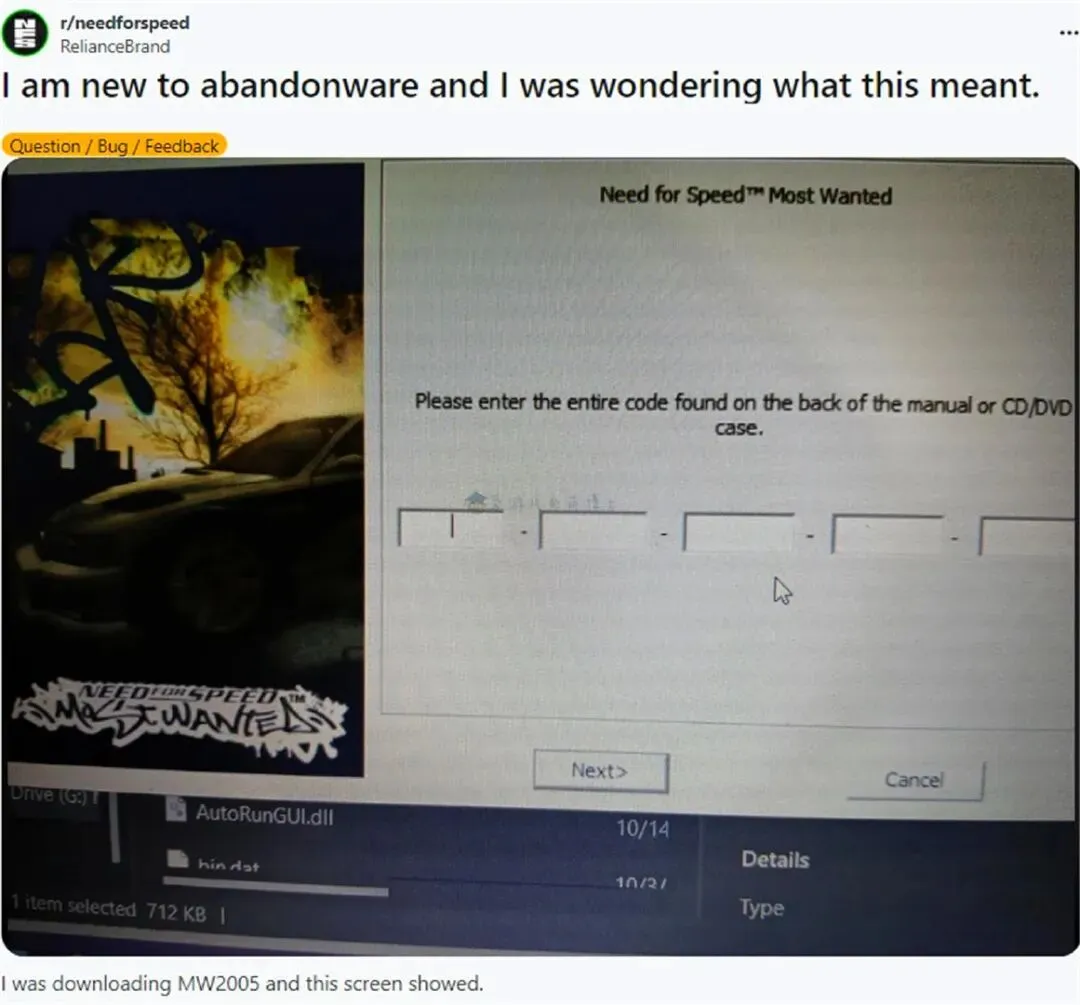 “我刚开始接触老游戏,这是什么意思?我下载了《极品飞车:最高通缉》,就出现这个画面了”。我们看到:他在安装游戏的时候跳出一个画面,要求他输入某种“写在手册或者光碟背面的完整代码”。年轻玩家们肯定也很疑惑,怎么玩个游戏还要输入代码呢?这是什么怪东西?至于《极品飞车:最高通缉(Need for Speed™ Most Wanted)》,则是美国艺电(EA)旗下EA Canada与Criterion Games联合开发、于2005年推出的赛车游戏。