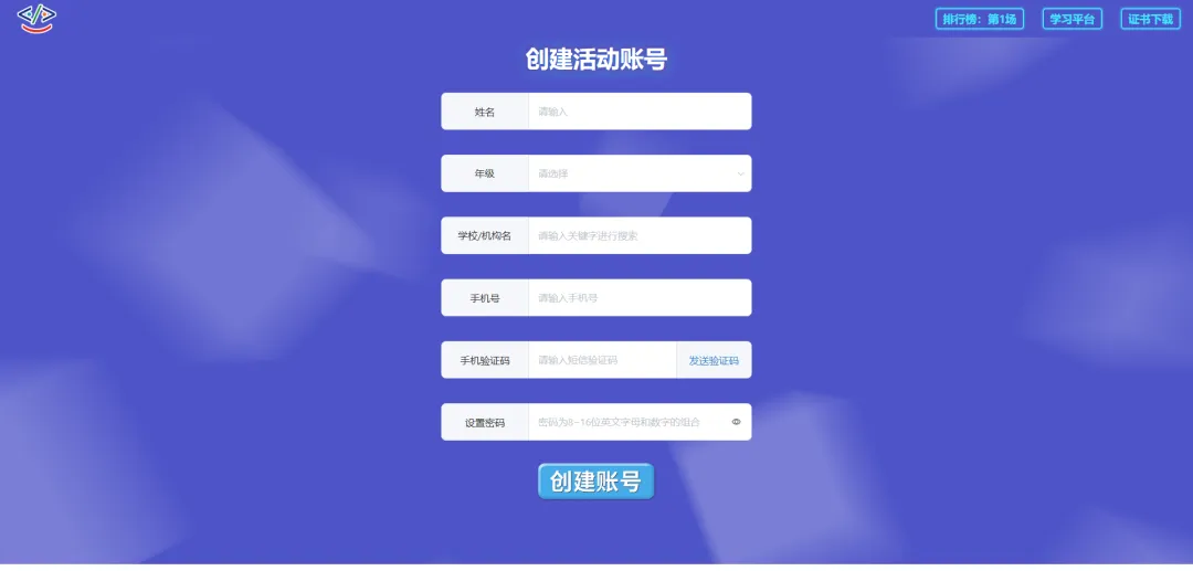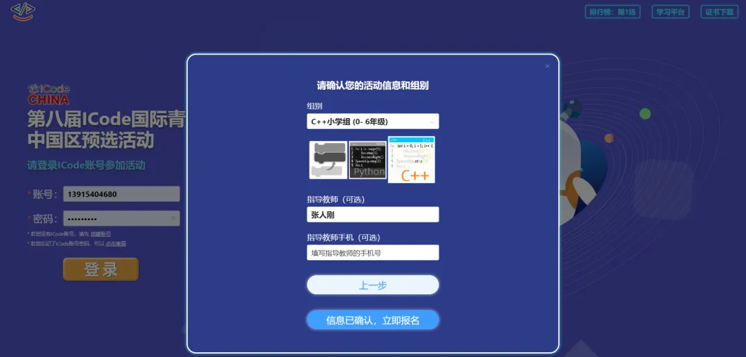 (2)填写学校名称、年级、姓名、账号(无账号填写注册手机,已有ICode后台账号直接填写即可)、组别、指导老师、指导老师手机号。