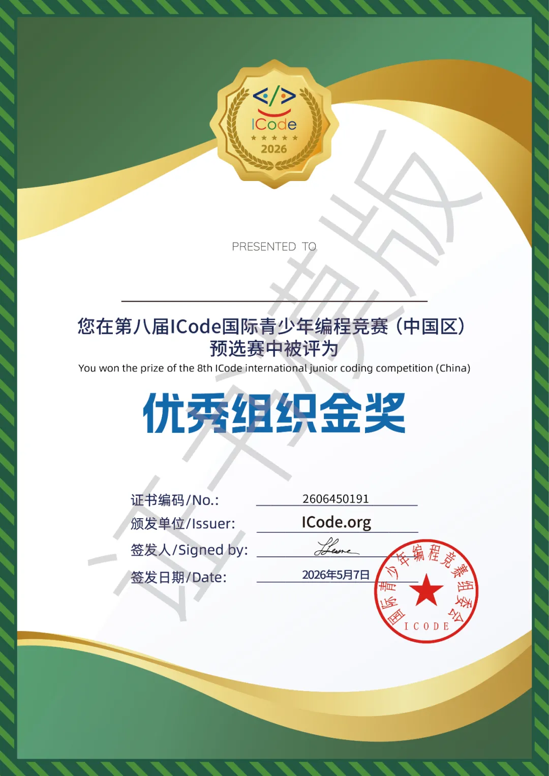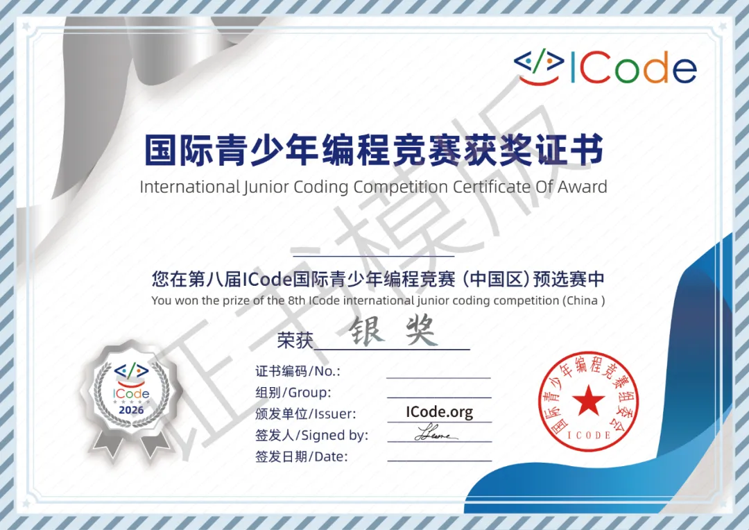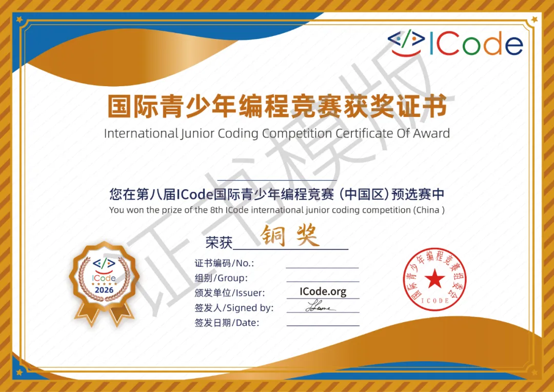 获奖选手将获得由ICode组委会颁发的电子证书,每场活动结束3个工作日后,选手可在ICode官网和学习平台查询和下载电子版证书(选手参加多次活动,最终成绩将以最高奖项成绩为准)。证书的真实性可在ICode官网查验。