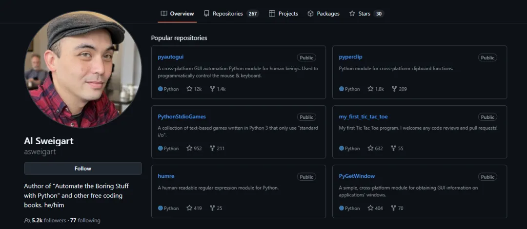 先看他的行业硬实力。作为Python软件基金会会士,他本身就是Python社区的权威人物,这一身份让他的教程自带“靠谱”背书;同时他还是资深软件开发师,一手打造了PyAutoGUI、pyperclip等热门开源模块,这些工具在GitHub上收获上万个星标,被无数开发者实际使用,足以证明他的技术功底。