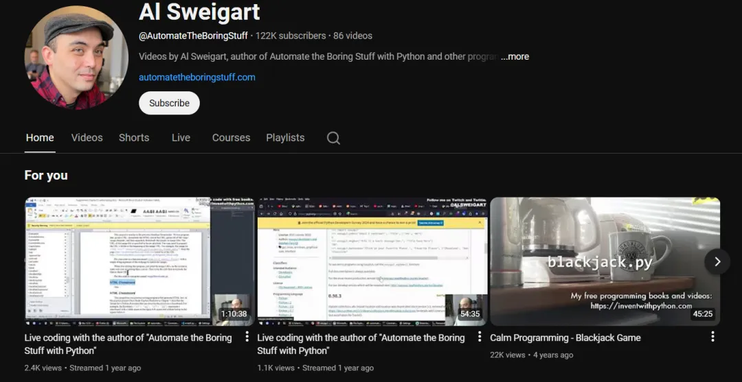 有趣的是,因为产出了太多优质内容,曾有人误以为阿尔·斯维加特是AI(一定程度上也是名字导致的)。对此,他只好在个人网站上无奈澄清:“关于阿尔(AI)是人工智能的说法纯属夸大其词。” 而这份接地气的态度其实也藏着他的教学初心,他不是高高在上的技术大牛,而是真心想推广Python、帮助更多人通过编程受益的引路人。