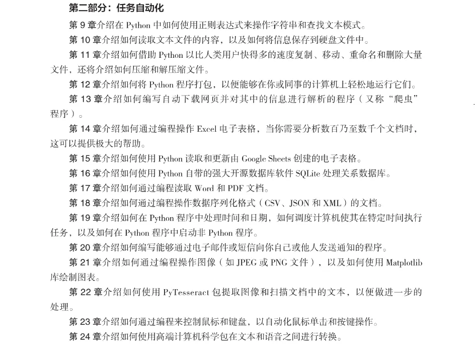 “书中包含如何用 Python 编写程序处理 Excel 表格、爬取网站数据、解析 PDF 与 Word 文档、发送邮件等提升效率的自动化任务,对上班族、科研人员和行政人员来说,都是极具价值的资源。”