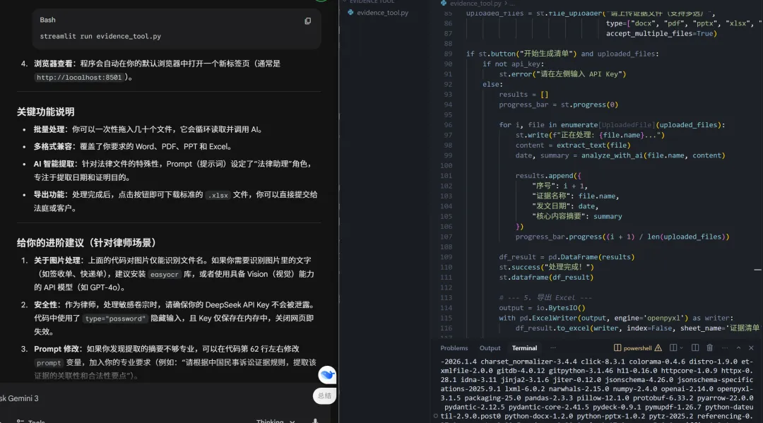 - 结构化输出:自动填充到预设模板中,生成结构清晰、格式标准的证据清单(.xlsx 或 .docx)。