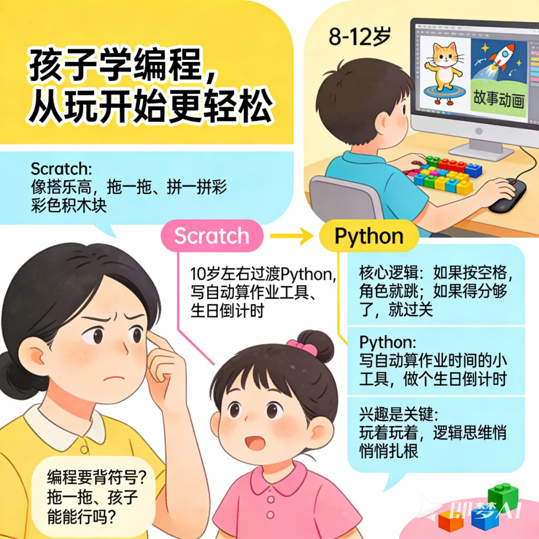 很多爸妈一听到“编程”就紧张:“是不是要背一堆天书一样的符号?我家孩子能行吗?”