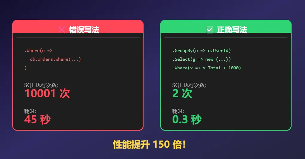 // 错误:Where 里套 Where .Where(u => db.Orders.Where(...)) // 正确:先 GroupBy 聚合,再 Join