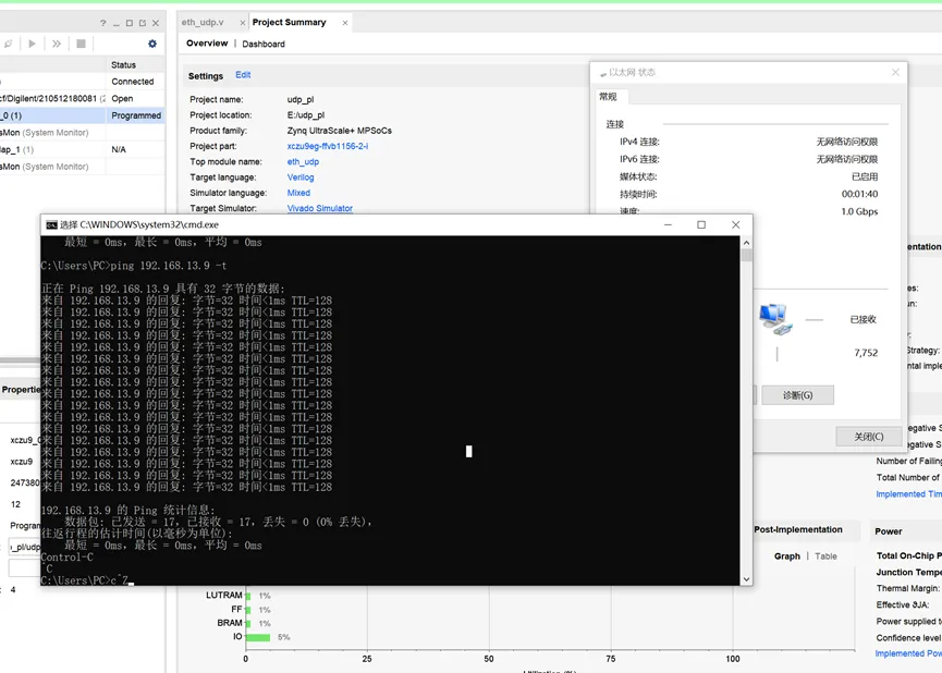 千兆以太网UDP协议Verilog代码FPGA实现,支持UDP协议,包含ARP、ICMP、UDP功能,支持ping命令,方便实际应用。UDP协议纯Verilog代码实现,IP仅使用了Xilinx内部的FIFO/RAM,方便不同平台适配。