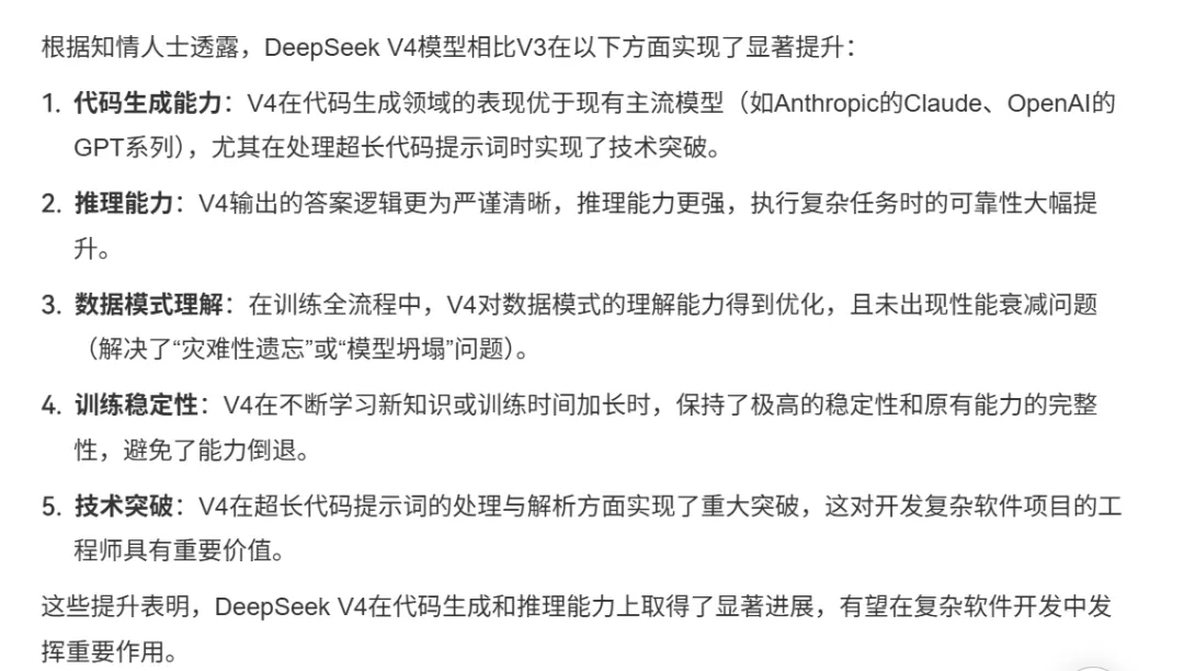 根据泄露的内部测试报告,DeepSeek V4在三个关键维度实现突破:
